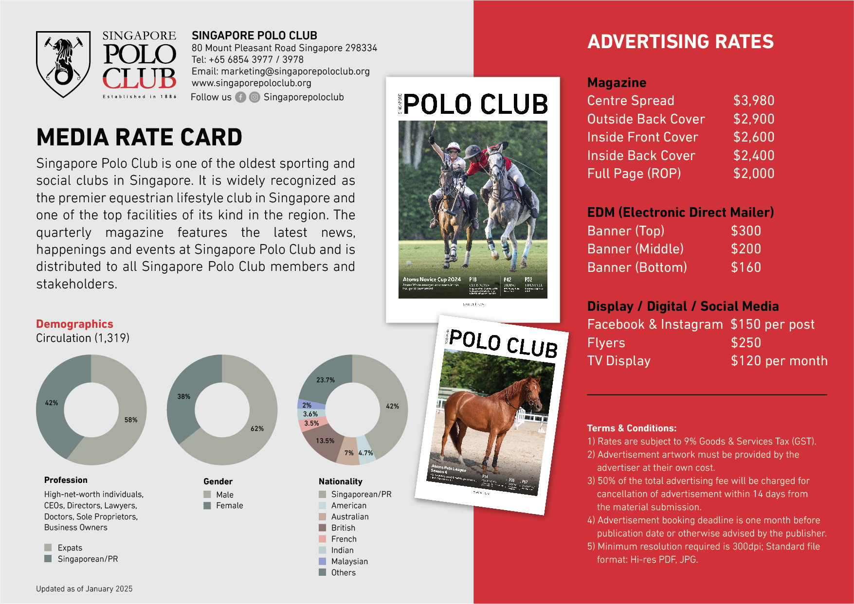 Singapore Polo Club reaches a database of 1,500 members comprising of high net worth individuals and jet-setting professionals such as CEOs, Company Directors, Doctors, Lawyers and Sole Proprietors.